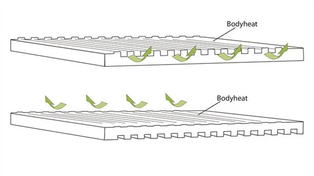 Ingenious heat regulation is achieved through offset air core sculpting which enables greater or less body heat retention depending on which mat side is slept on – a real performance boost when needed for optimum year round comfort. When the mat is turned with the air cores next to the body excessive heat can escape making it easier to cool down during warm summer nights. When the mat is turned the opposite way it gives the user the optimal insulation as the body heat is reflected by the foam. This option is used in colder nights. This air core design also offers campers a softer sleep sensation as well as better ease of packing, lower weight and neater packed size.
