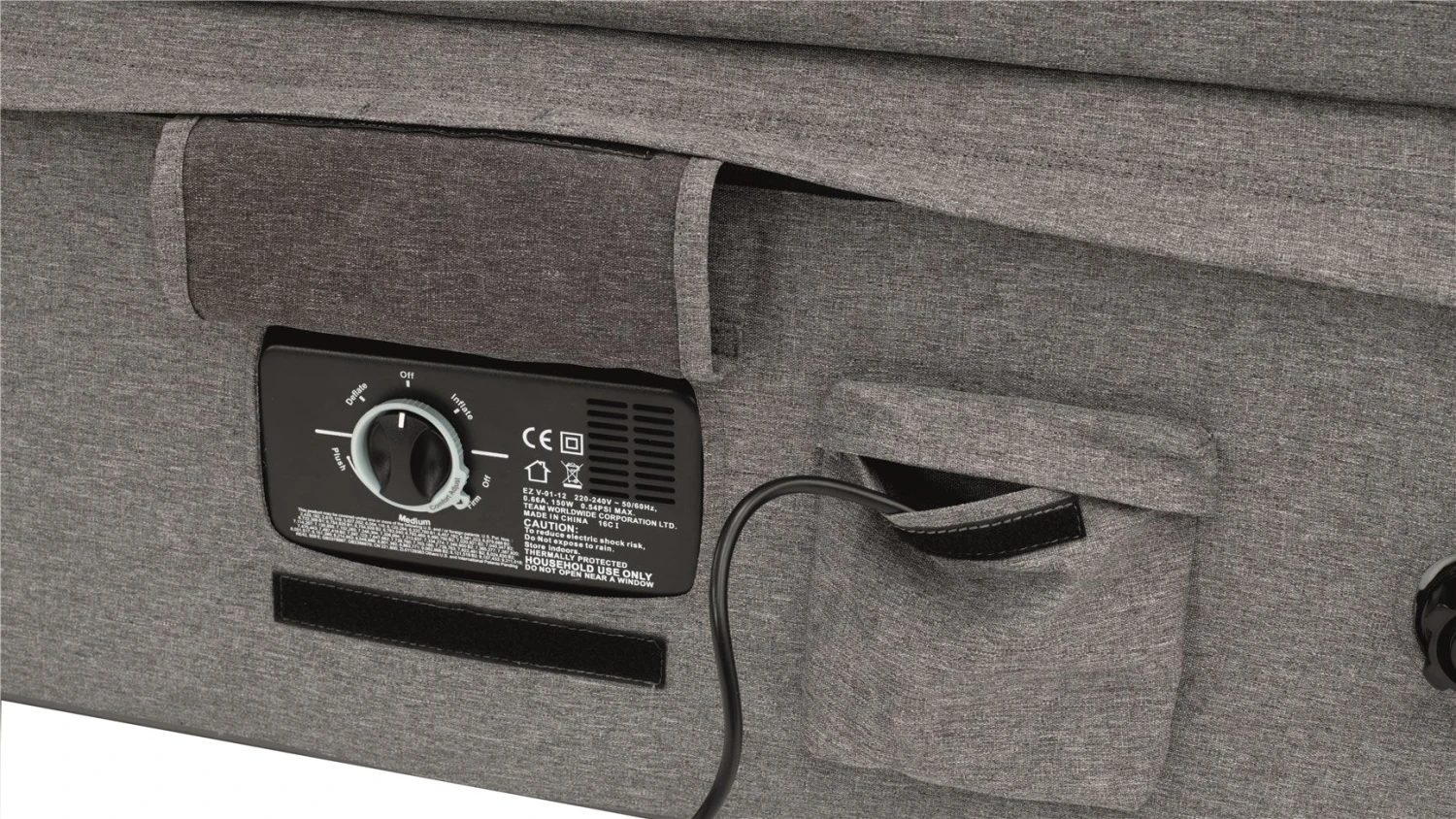 Quick and easy inflatable seating for home-from-home comfort, Soft, comfortable detachable cover, Durable PU-Coated two-tone fabric cover with+30 UPF and HH850mm, Wide and supportive armrest, 230V built-in pump with auto stop and comfort adjuster for easy inflation, supplied with 230v EU and UK plugs, Includes carrybag for easy storage and portability, Big on comfort and small on pack size.