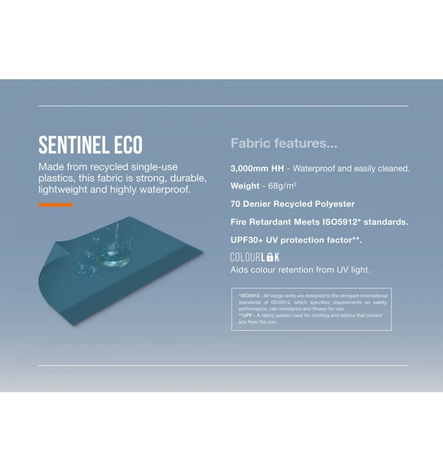 - Sentinel Eco Fabric– With a development focus on the environment, we’ve taken single-use waste plastic and transformed it into our Sentinel Eco fabric. Packed with the durability and quality you would expect from Vango, Sentinel Eco also benefits from a 3000mm HH rating. Perfect for weekend and holiday camping while supporting our environment